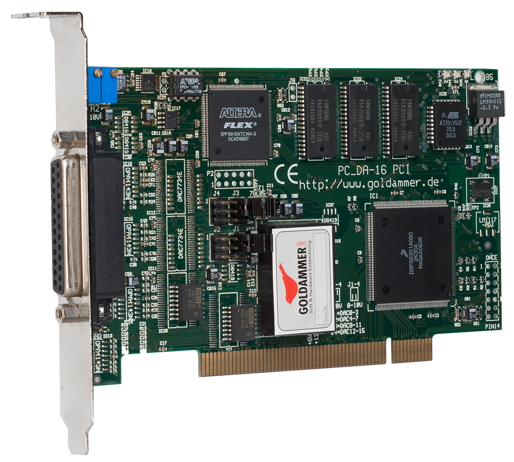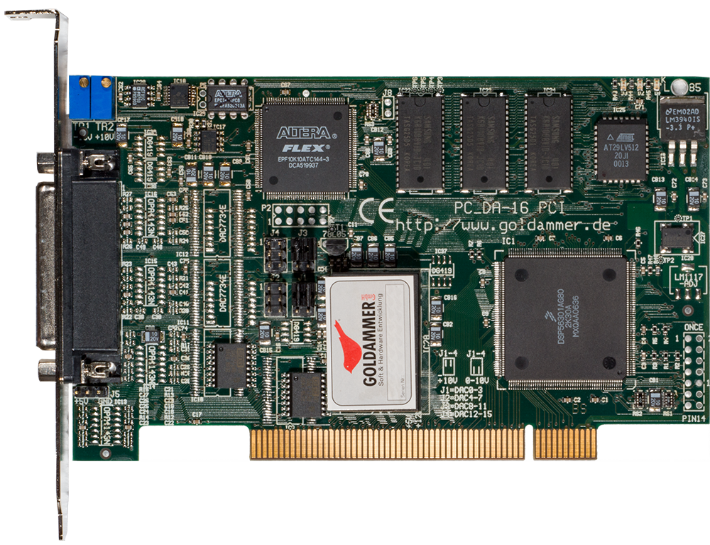 Intelligent PCI card for analogue signal output with digital signal processor Freescale DSP56301, 100MHz, 384kB memory 8x12bit analog output, conversion rate 100kHz per channel, output range 0-10V, ±10V, 1x24bit counter input (impulse counting, frequency measurement 10Hz resolution)